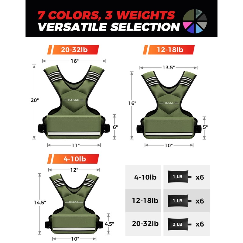 BAGAIL Adjustable Weighted Vest, 4-10lb/12-18lb/20-32lb Rucking Vest for Women & Men with 6 Weights & Large Pocket, Weight Vest for Home Workouts, Running, Walking and Strength Training - Green