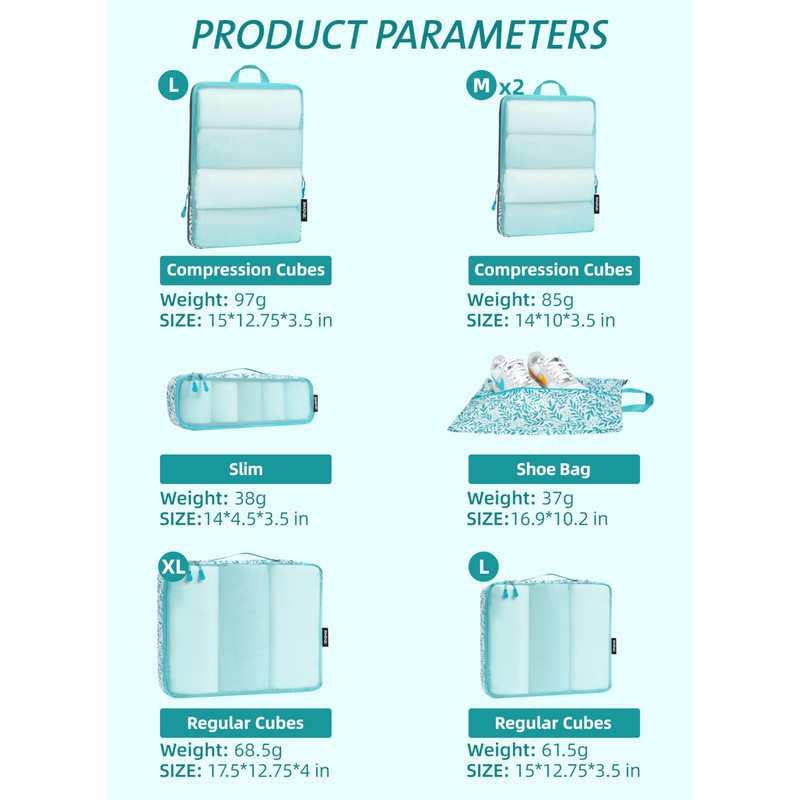 • Well Organized: We offer 3 regular and 3 compression packing cubes with 1 shoe bag to meet your different packing needs; Classifying and organizing your belongings for your travel will become easy with these ultralihgt packing organizers