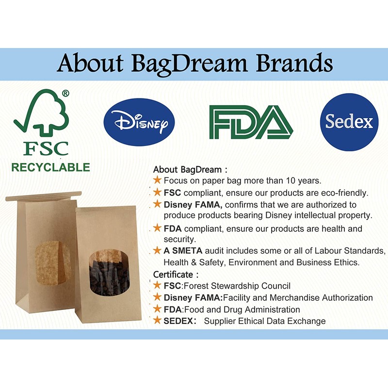 - Small Bakery Bags Size: 3.54x2.36x6.7". FDA compliant. Nice window bags as gift for 8oz roasted coffee beans, cookies, granola, trail mix, popcorn, candy bar, goodie and etc.