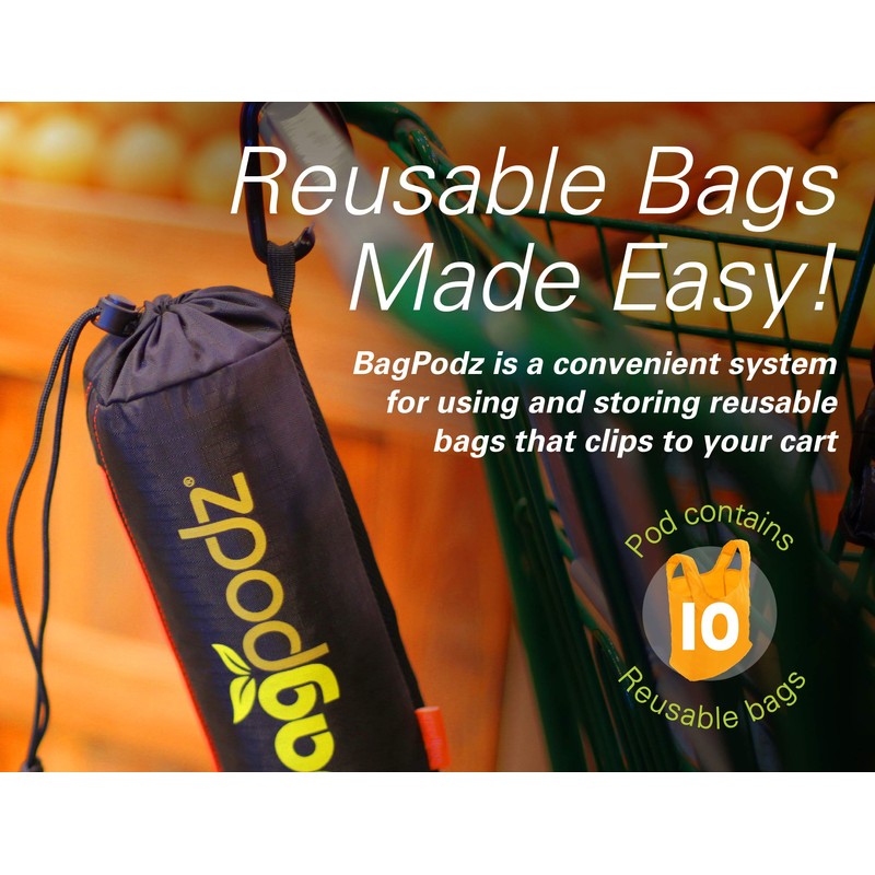 - REUSABLE BAGS MADE EASY – BagPodz is a portable pod of reusable grocery bags that conveniently clips to your cart. It's the ultimate eco-friendly solution that ends the need for plastic bags, as well as improving your shopping experience. Includes 10 bags