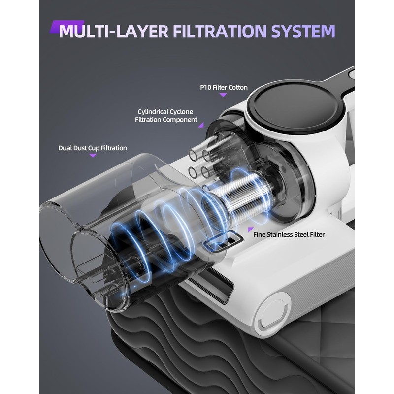 - Dual-Cup Dust Separation Technology: This mattress cleaner uses dual-cup airflow separation and a five-cone cyclone system with P10 filter cotton to effectively trap particles as small as 0.3 microns, keeping the exhaust air clean. The left cup separates large dust particles and hair, while the right side filters fine dust, ensuring optimal dust capture and protecting the motor from clogging.