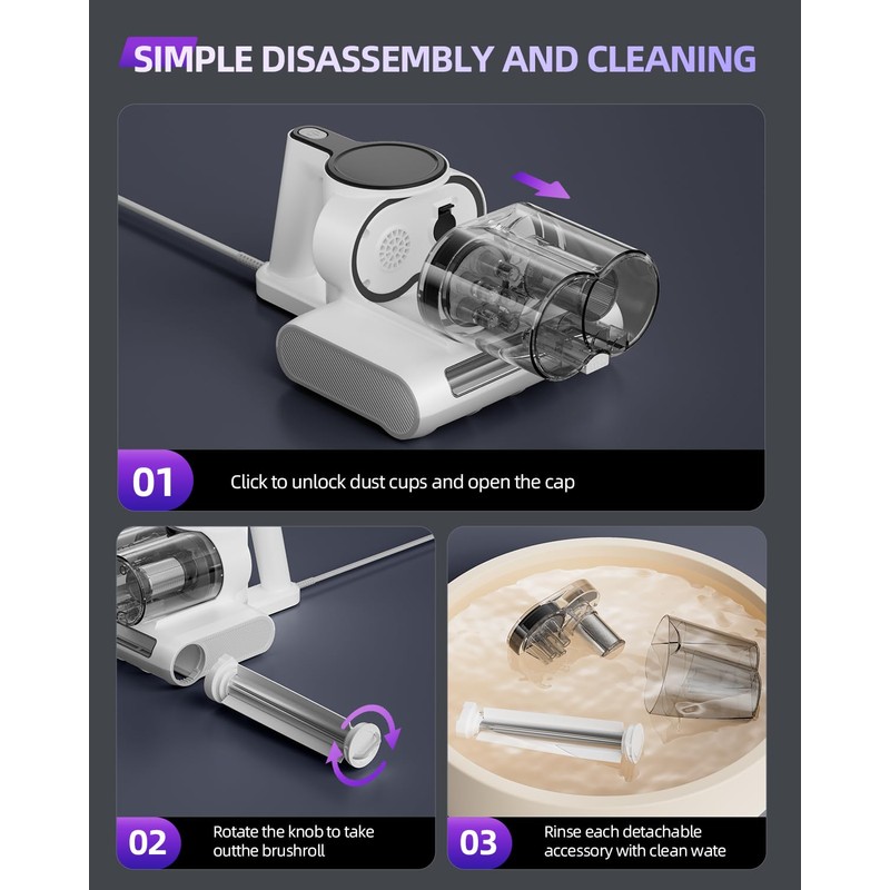 - Deep Cleaning and Dust Removal: Equipped with a 253.7nm UV light source and a 149H (65) heating function. The powerful UV light penetrates deep to destroy dust. The UV light automatically turns off if the vacuum is tilted or lifted from the mattress.