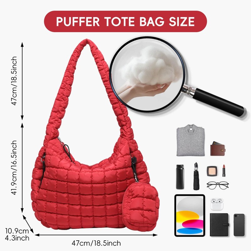 - [Large Puffer Tote Bag] Measuring 18.5 x 16.5 x 4.3 in; this quilted tote bag is spacious enough to hold all your daily essentials without being bulky. and the quilted hobo bags for women are roomy enough to fit your tablet, cellphone, laptop, books, makeup, sunglasses, umbrella, and more. With this puff bag‘s trendy puffer bubble design, you're sure to receive compliments when you carry this adorable quilted tote bag.