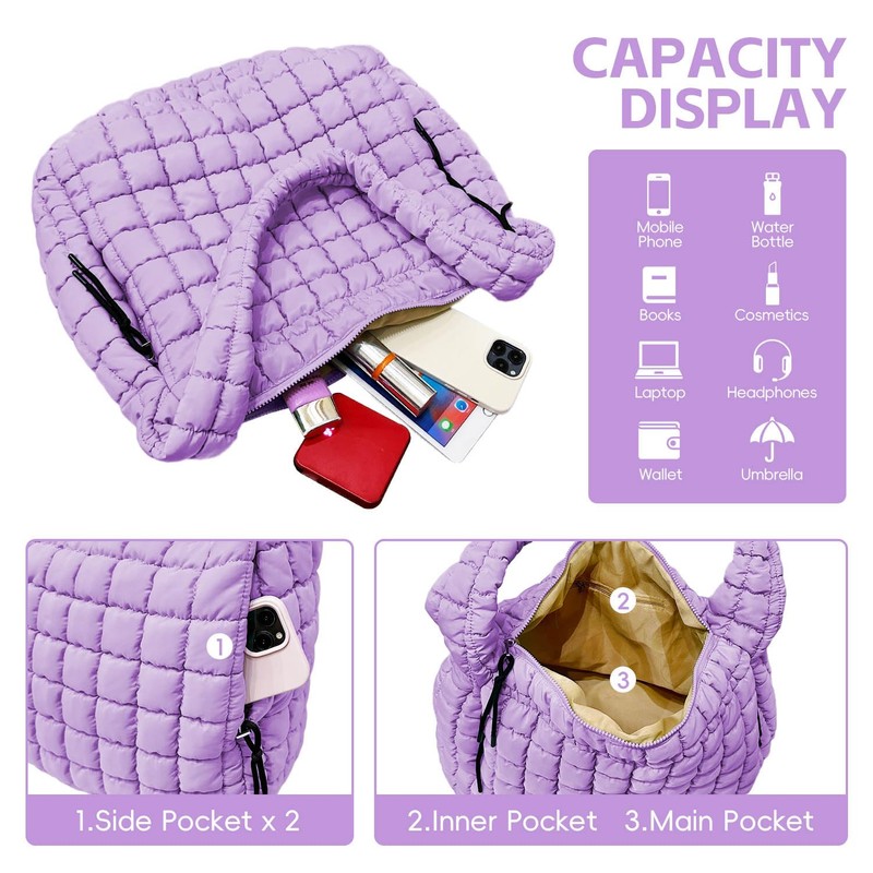 - [Multi Zippered Pockets for Better Organization] Trendy Puffer Bag comes with multiple zippered pockets to keep your essentials safe and organized. The puffy tote bag is designed with 2 side zip pockets for easy and quick access to items like keys, cellphone or cards. Large main compartment design with a zippered pocket and 2 wall pouches for storage.