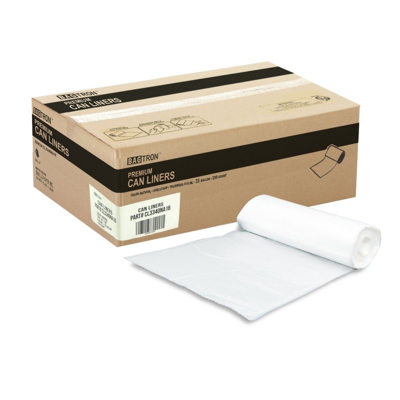 Bagtron 33 Gallon Trash Bags, 16 Micron High Density Pure HDPE Garbage Can Liners Bulk, 33" x 40", Natural Clear, 250 Count