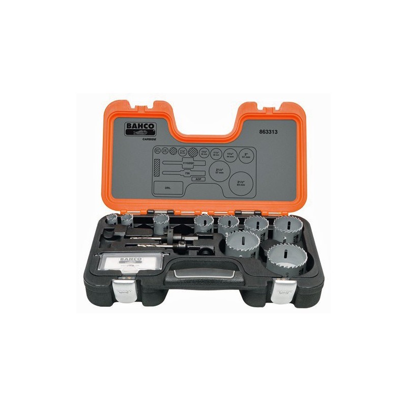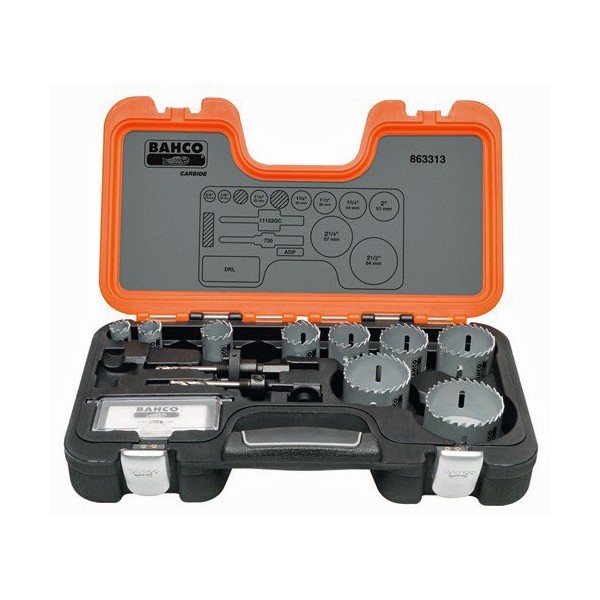 BAHCO Hole saw Sets - Assortment of hole saws and accessories most commonly used by the trades, especially electricians and plumbers. Each packed in a durable plastic carrying case for convenience.