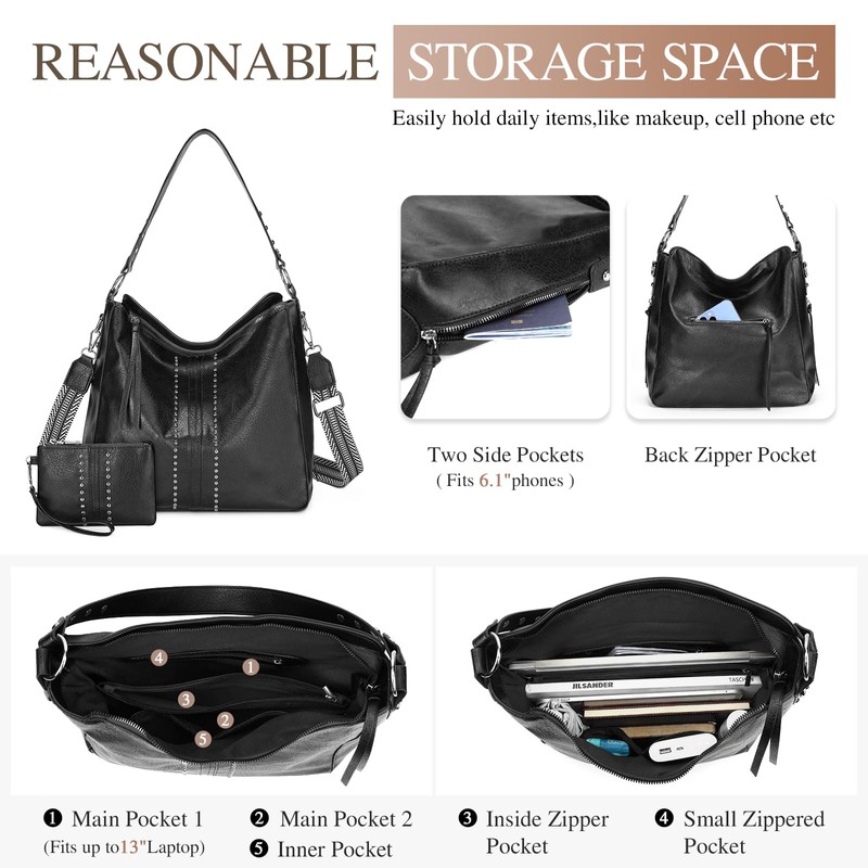 - Women's handbag set with zip for optimal safety: the main zip pocket for tablets under 11 inches and contains 3 open small inner compartments and 2 zip pockets inside for small important items. The shoulder bag has a zip compartment on the back in which frequently needed items can be stored. The rectangular wallet also has a zip