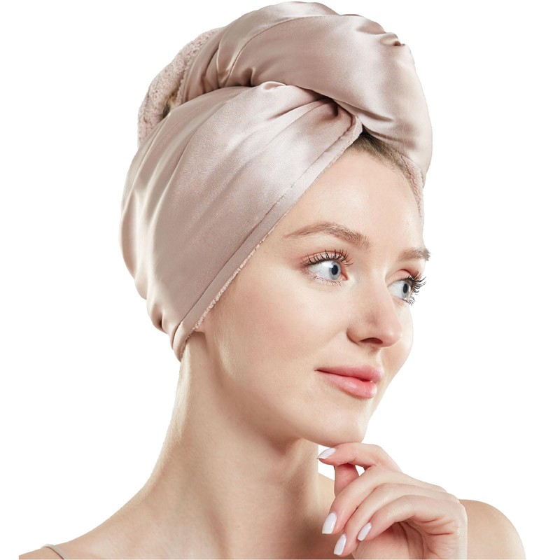 - Reversible: The surface is made of 6A natural silk 100% satin fabric, so it can protect your hair from drying and moisturizing. The reverse side is made of microfiber towel fabric that is super absorbent and quick drying, and the button and loop ties are durable and will not fade, so you can use it with confidence