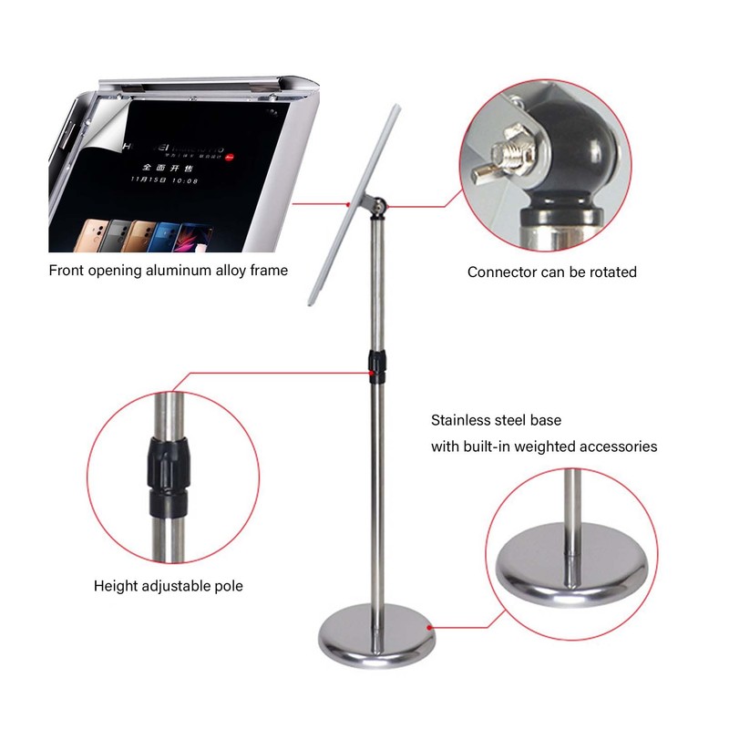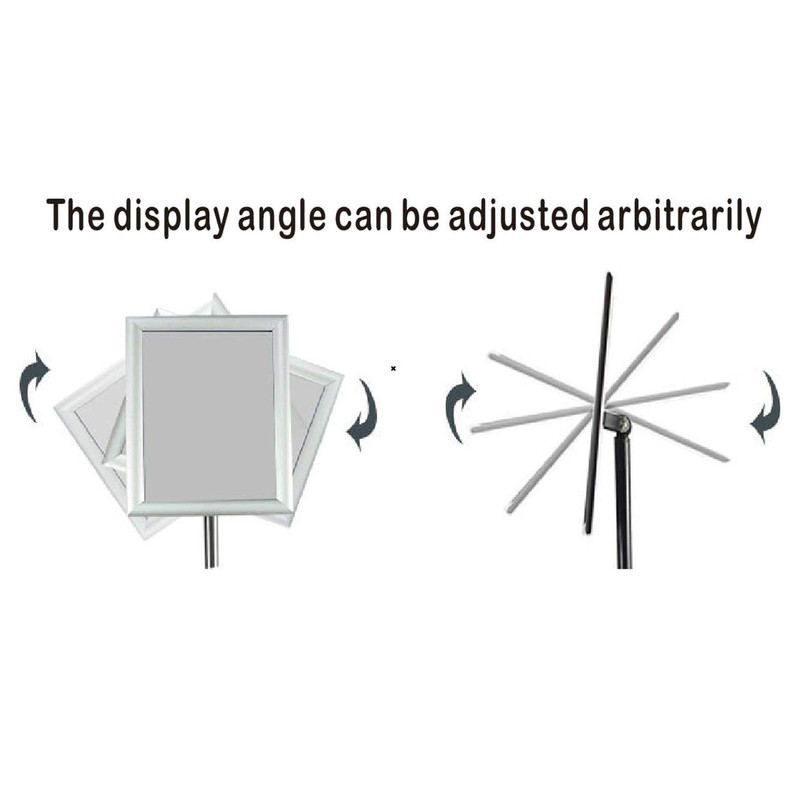 - The frame of this standing card adopts an open aluminum alloy frame, and the installation and replacement of the screen are very convenient. The viewing angle of the frame can also be adjusted freely from 0- 360 degrees.