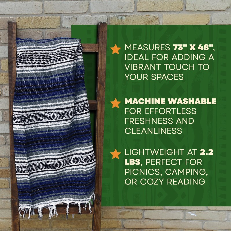 - MADE IN MEXICO FROM RECYCLED YARNS — Sustainably crafted with a blend of recycled fibers, the thick Mexican blanket offers vibrant color, unique style, and unmatched comfort. Durable and machine washable, these Mexican blankets and throws are perfect for campfires, chilly nights, or cozying up anywhere