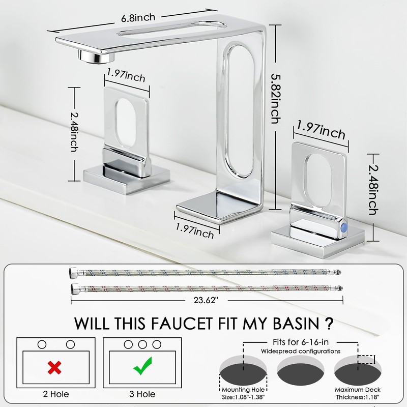 - 【HASSLE-FREE INSTALLATION】 Designed for 6–16" installations, this 8-inch widespread bathroom faucet includes everything you need: 2 quick screw-in fitting hoses, and hot and cold water supply lines with built-in rubber rings to prevent leaks. With clear installation instructions, you can easily install it yourself for a hassle-free experience