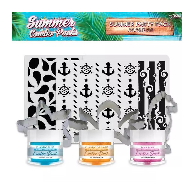 Create your own trip to paradise when you pick up our New Summer Party Packs. Brimming with an array products, this baking gift set features some of our summer themed metal shaped cookie cutters, decorating & craft stencils and beautiful Luster Dust edible glitter and paint. It has everything you can think of to whip up the ultimate celebration! Summer fun is never ending once you pick up one of these must-have combo packs.