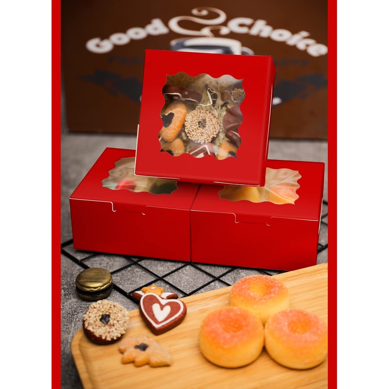Bakepacker 60pcs Red Bakery Boxes with Window 6x6x3 inches Thick & Cookie Boxes & Sturdy Macaroon Pastry