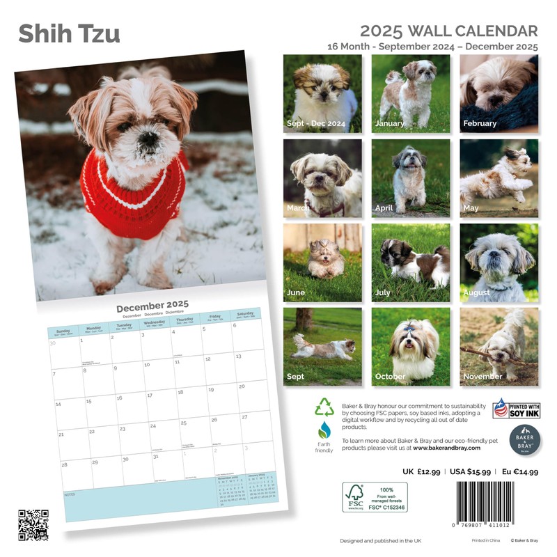 Baker and Bray Shih Tzu Calendar 2025, Large Square Wall Calendar With Organisational Stickers, 16 Month, Shih Tzu Gift Dog Calendar