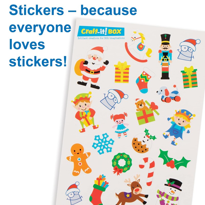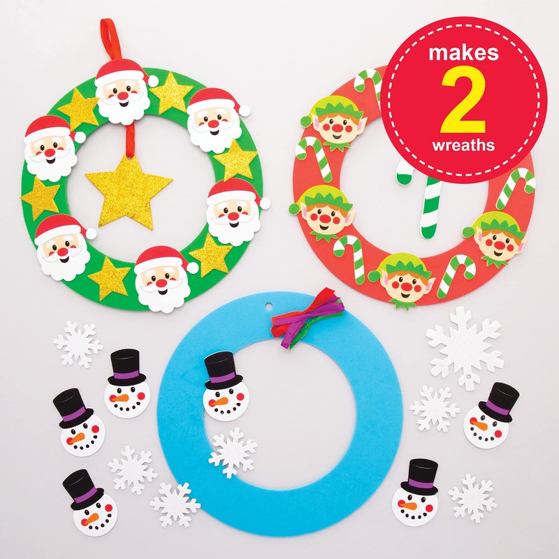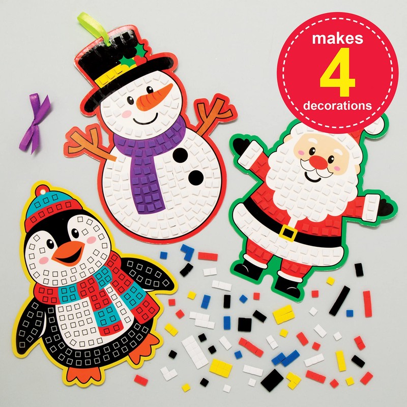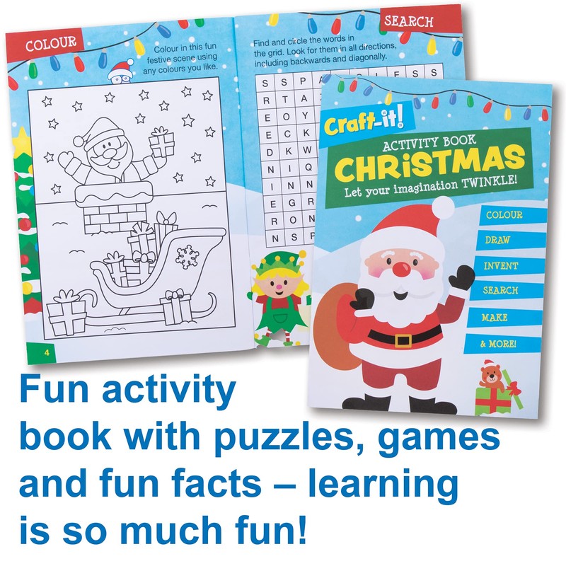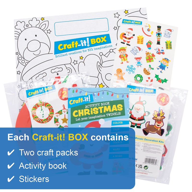 - Pack Contents: Christmas Wreaths Decoration Kits – Kids can arrange the shape around the base and decorate it (pack includes card template, self-adhesive foam pieces & ribbon). Christmas Mosaic Decoration Kits – Children will enjoy matching the squares to the guides on the blank, ensuring the right colours are adorning the correct sections (pack includes card template, self-adhesive foam pieces & ribbon). Christmas themed Sticker Sheet, and a 16 Page Activity Book (contains educational quizzes, colour in activities, puzzles, craft ideas and a recipe for Gingerbread). Finally, the box is also a creative activity as it can be coloured in and decorated, too!