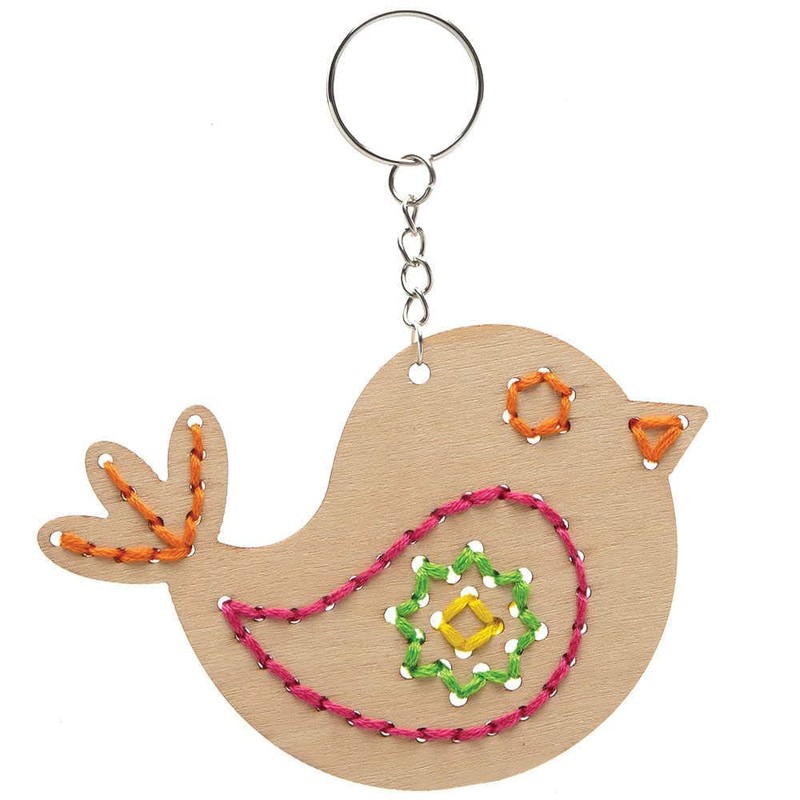 - Included in the Pack: This pack contains 5 kits. Each kit includes pre-punched wooden bird, keyring attachment, embroidery thread and plastic needle. Size 7cm. Age 5+.
