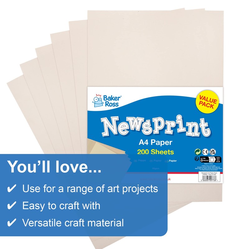 Baker Ross FX842 A4 Newsprint Paper Pack - Pack of 200, Paper for Wrapping and Arts and Crafts