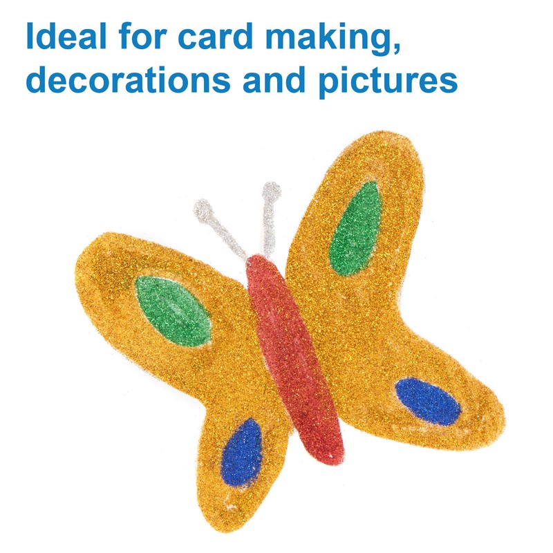 - Craft Glitter: Baker Ross glitter comes in handy shakers with pouring and dispensing lids, which make it so easy to add sparkle to a range of surfaces and crafts including wood, paper, card and more!