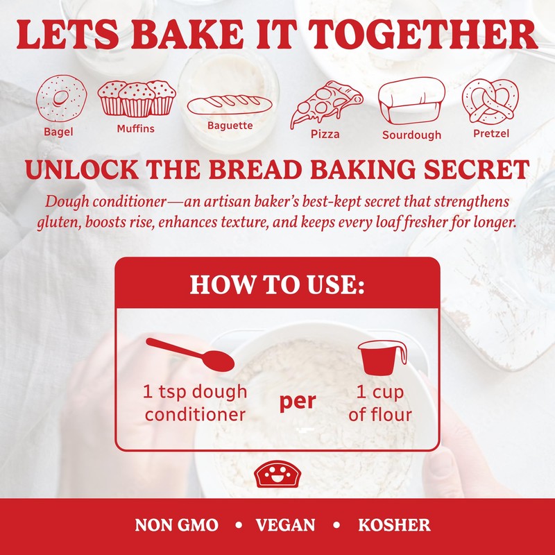 - Extend Freshness and Shelf Life: Keep your baked goods fresher for longer with our Dough Conditioner. Maintain that fresh-from-the-oven taste and aroma, and enjoy lighter, fluffier bread that stays delicious over time.