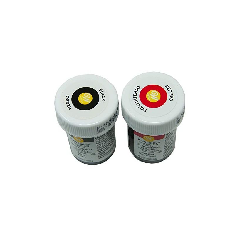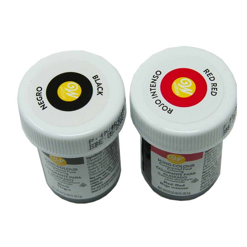 - Wilton Icing Color Black and Red no Taste are concentrated food coloring.