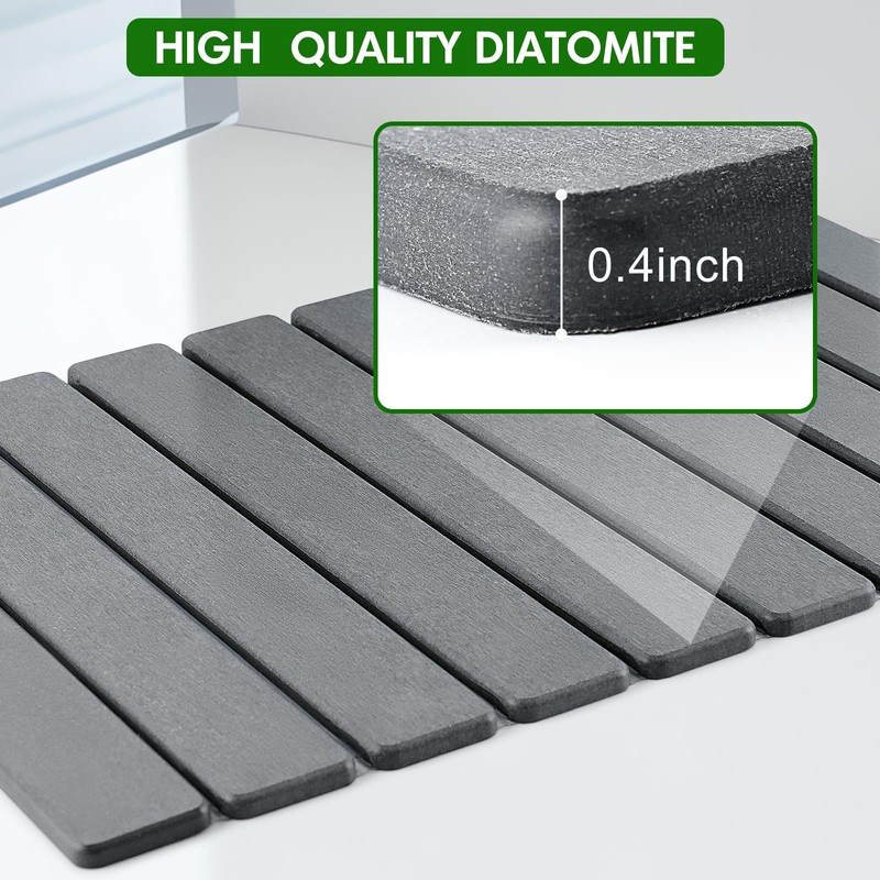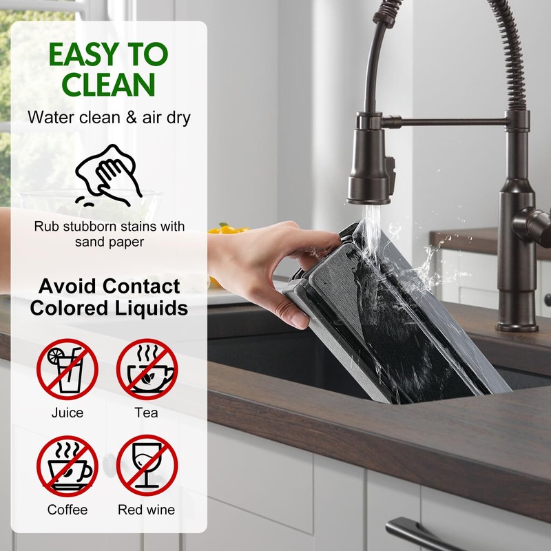 • ‌Fast-Drying Stone Mat:‌ Its porous structure allows water to evaporate quickly, preventing moisture buildup, keeping your kitchen countertops clean.The stone drying mat features a non-slip PVC base and smooth edges for enhanced safety.