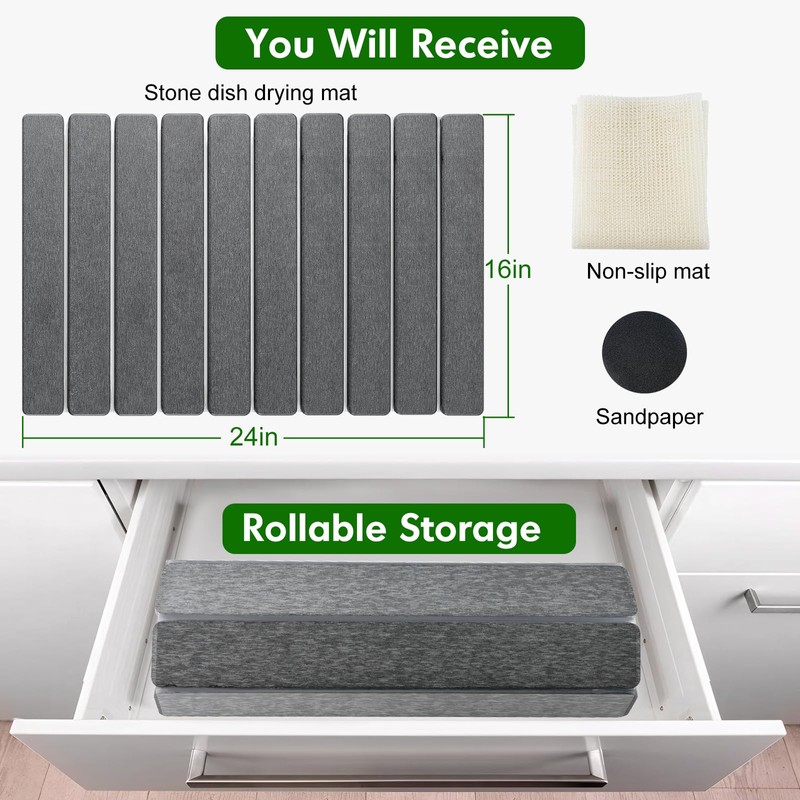 • ‌Rollable Design:‌ Includes one 24"×16" diatomite mat, one sheet of sandpaper, and one non-slip mat. The roll up design saves significant storage space.