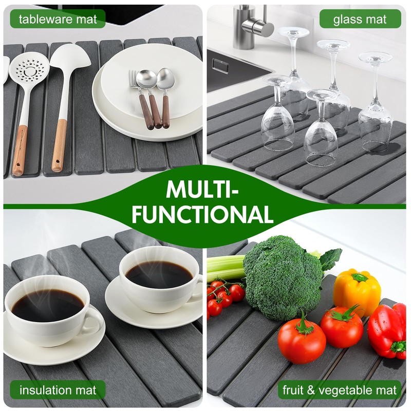 • ‌Versatile Helper: The kitchen stone drying mat can be used as a tableware mat, glass mat, fruit & vegetable mat, and even a heat insulation mat to better protect the kitchen countertops. Its premium texture complements any kitchen style.