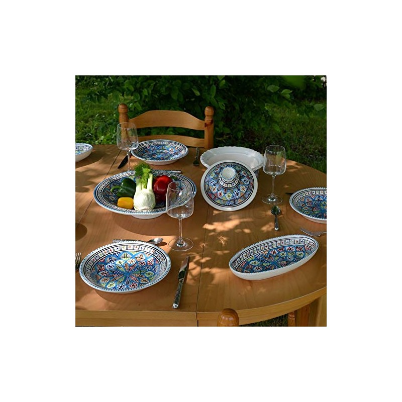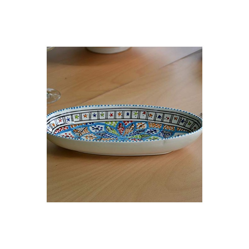 - This dish, decorated entirely by hand, will allow you to serve your vegetables and meat beautifully on the table. Length: 20 cm / Depth: 5 cm / Width: 9 cm - Dishwasher and microwave safe. Food product