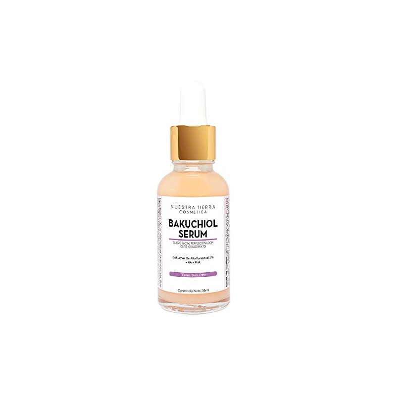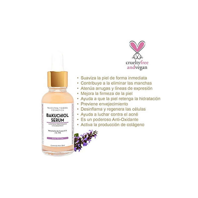 - sensibiliza la piel. Formulamos este Elíxir con 1% de Bakuchiol de Alta Pureza, 4% de Gluconolactona (PHA) y Ácido Hialurónico Vegano (HA) además, incluimos Clorella un alga de agua que estimula la actividad celular, incrementa la síntesis de colágeno, aumenta la firmeza facial y disminuye el efecto de sombras debajo de los ojos, así como extractos herbales que ayudan a eliminar las manchas. Sus Beneficios: Suaviza la piel de forma inmediata Contribuye a la eliminar las manchas Atenúa arrugas y líneas de expresión Mejora la firmeza y la elasticidad de la piel Humecta, Suaviza y retexturiza la piel Ayuda a que la piel retenga la hidratación Previene el crono y el fotoenvejecimiento Desinflama la piel y estimula la regeneración celular Apto para todo tipo de piel incluso las más sensibles Ayuda a luchar contra el acné Es un poderoso Anti
