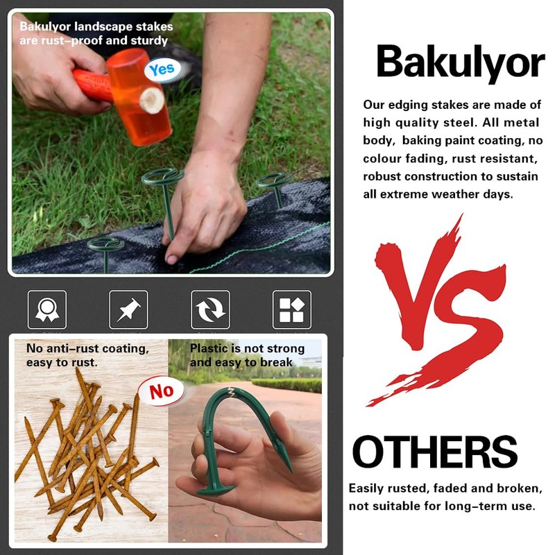 - Easy to Install - These sturdy steel landscape stakes have a pointed tip for faster, deeper insertion into the soil(except concrete and rock). For smaller projects, you don't need to hire a professional to install them, and just gently tap the landscape staples with a rubber mallet or wooden hammer and easily insert them into the soil in just 30 seconds.