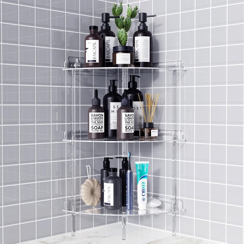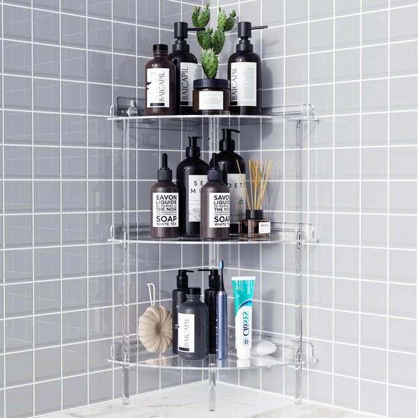 Bakzon Corner Shower Caddy, 3 Tier Acrylic Shower Organizer Corner for Inside Shower, Rustproof Floor Standing Shower Shelves for Bathroom, Clear