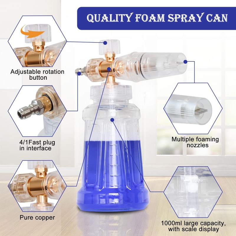 - Balabulala 5000PSI Pressure Washer Gun with Dual Adjustable Spray Fan Foam Cannon: Selkie foam cannon is very effective when you need to remove ingrained dirt, dual adjustable spray fan for vertical and horizontal adjustments, wide fill canister to prevent tips and spills, great choice for car washing and cleaning. Container Capacity: 1 Liter / 0.22 Gallon. Specification: 1000 PSI to 4350 PSI.