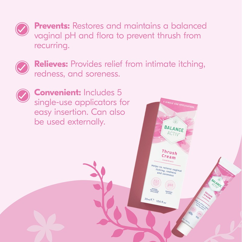 Level up your intimate care with Balance Activ Thrush Cream. Our treatment with 3 benefits is designed to help your body fight the cause, relieve the symptoms, and prevent the recurrence of thrush. While thrush is an incredibly common and completely normal condition, we know how uncomfortable it can be in day-to-day life. But there’s no need to suffer in silence; Balance Activ Thrush Cream can make you feel better. Here’s how: firstly, this cream forms a protective barrier over irritated skin which limits the adhesion of harmful yeasts and microorganisms, keeping for them an adverse vaginal environment; this allows the body to fight the cause of the infection. Secondly, the soothing formula provides effective relief from the symptoms, which may include intimate itching, redness, and soreness. Thirdly, it helps restore and maintain an optimal vaginal pH to promote a healthy vaginal flora and prevent thrush from recurring. And it’s not a drug! Easy to use, it comes with 5 single-use applicators for convenient, mess-free internal application. You can also apply the cream externally to ease discomfort. Add it to your evening routine every 3 days to prevent thrush and support good vaginal health or use it once a day for at least 5 days for management of thrush. Balance Activ Thrush Cream has no fragrance and paraben added. Balance Activ Thrush Cream: it works, simply. Balance Activ Thrush Cream is applied into the vagina and to the surrounding vaginal area to relieve symptoms of thrush. The cream can be inserted into the vagina using the enclosed applicators and is compatible with the use of latex condoms. For the management of thrush, apply Balance Activ Thrush Cream once a day for at least 5 days, preferably prior to sleep. For prevention of thrush or to support good vaginal health, apply once every 3 days before sleep. To relieve vaginal itching, redness, soreness and discharge apply the cream as and when required.