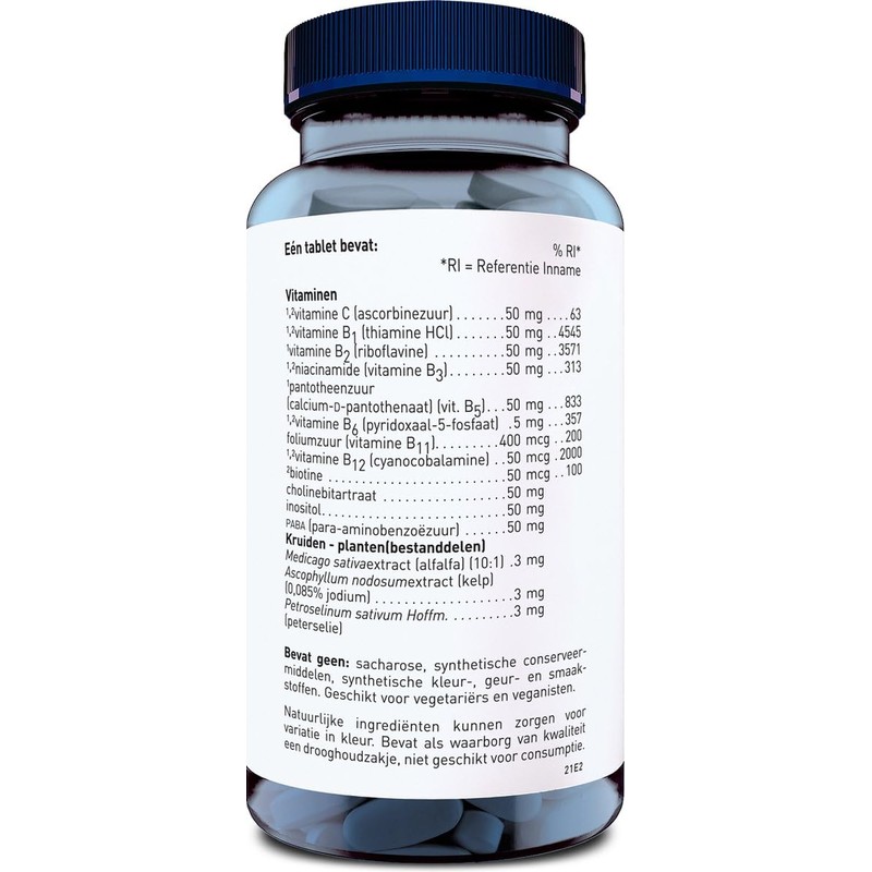 - B-50 & C delivers 50 mg vitamin C per tablet, 50 mg each B1, B2, B3, B5, choline, inositol, PABA and para-aminobenzoic acid, 25 mg B6, 400 mg folic acid, 50 mcg B12 (cyanocobalamin) and biotin and 3 mg of brunn. cccccccfa, kelp and parsley