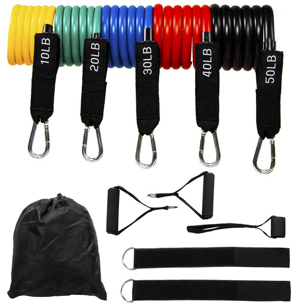 - 10 pcs, 5 bands at different resistance levels.; two foam handles; ankle strap; door anchor; carrying bag