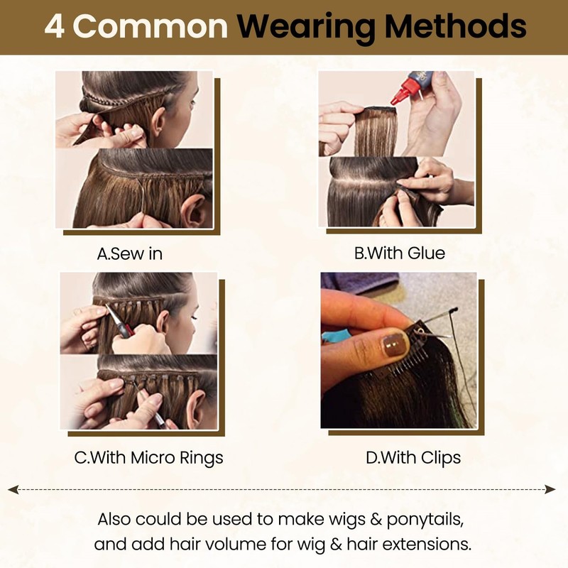-can sew in, micro link in, clip in, glue in, and make wig, 1 extension can achive various hairstyles.