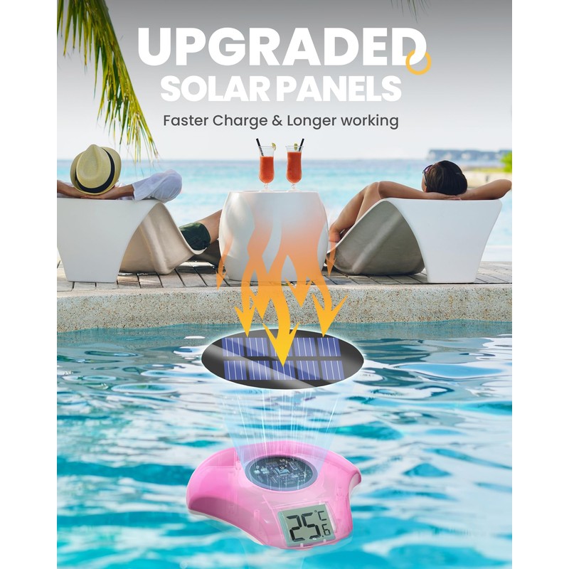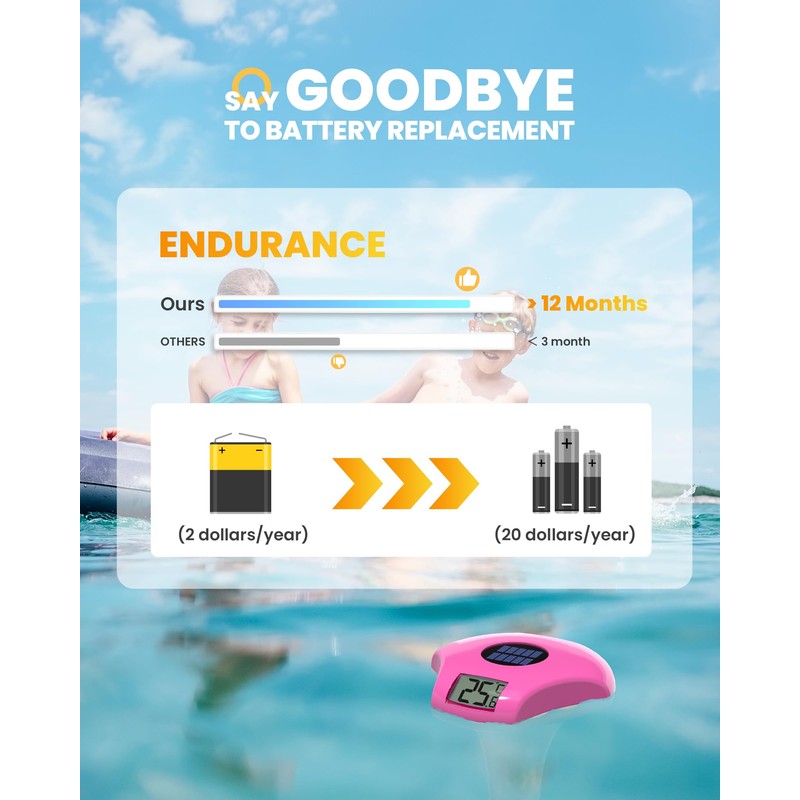 - Energy Saving The pool thermometer floating utilizes advanced solar technology and consumes only ? of the energy compared to traditional dry cell pool thermometers. By utilizing solar energy, we greatly reduce our dependence on traditional batteries.