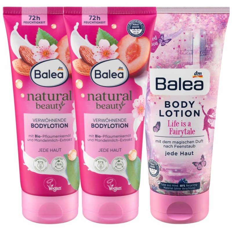 - Balea 3er-Set Hautpflege: Natural Beauty Bodylotion PFLAUME MANDELMILCH für normale bis trockene Haut (2 x 200 ml) + Bodylotion LIFE IS A FAIRYTALE mit magischem Duft nach Feenstaub (200 ml), 600 ml