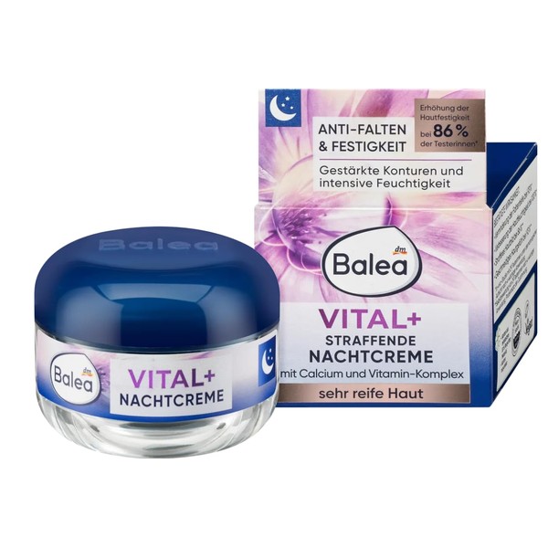 Intensive care for the highest demands: Balea Vital+ specially designed for the needs of very mature skin - for new resistance and strength. The combination of active ingredients with a vitamin complex of vitamin E, vitamin B 3 and provitamin B 5 regenerates the skin overnight. The rich formula with Peptide Complex, Calcium and Vitacell strengthens the skin, reduces the depth of wrinkles and prevents skin sagging. The formula with soy oil nourishes the skin noticeably supple. *In vivo study with 29 female testers under dermatological supervision after 4 weeks of use. Formulated without microplastics and water-soluble pure synthetic polymers. Skin compatibility dermatologically tested.