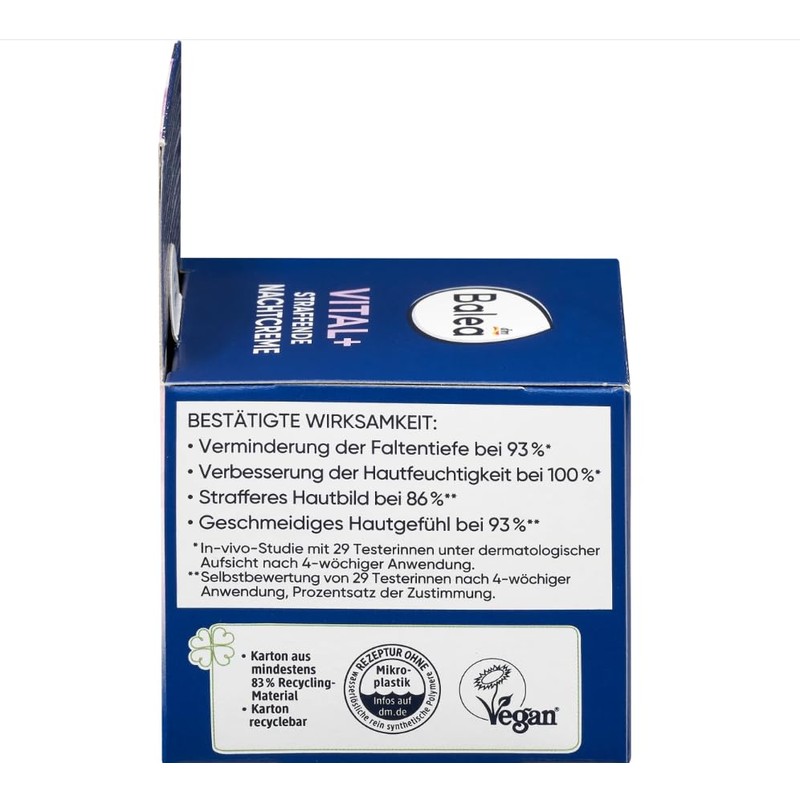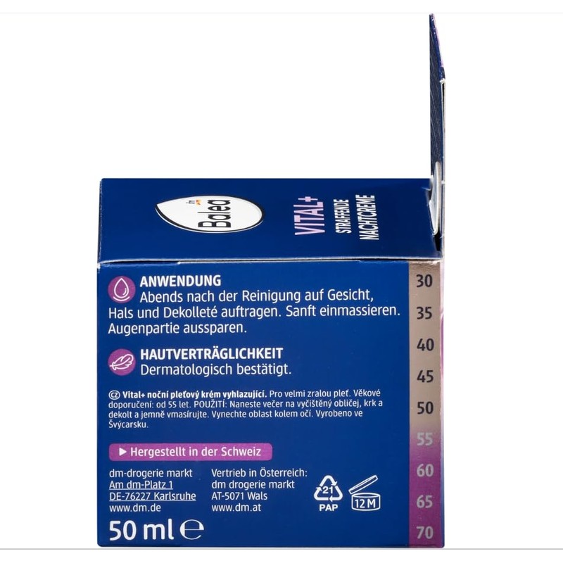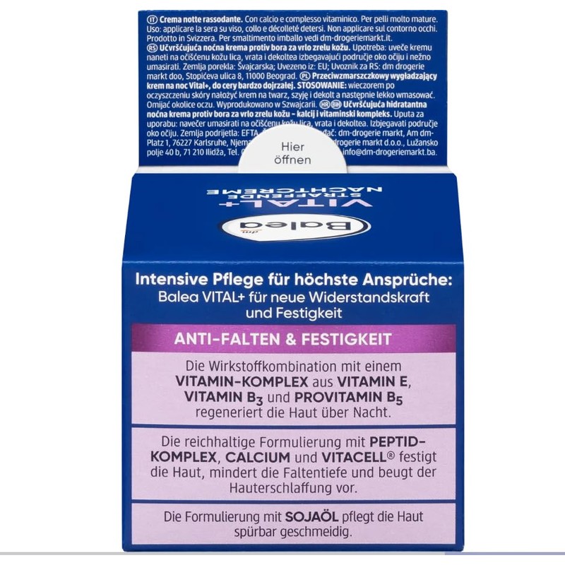 Intensive care for the highest demands: Balea Vital+ specially designed for the needs of very mature skin - for new resistance and strength. The combination of active ingredients with a vitamin complex of vitamin E, vitamin B 3 and provitamin B 5 regenerates the skin overnight. The rich formula with Peptide Complex, Calcium and Vitacell strengthens the skin, reduces the depth of wrinkles and prevents skin sagging. The formula with soy oil nourishes the skin noticeably supple. *In vivo study with 29 female testers under dermatological supervision after 4 weeks of use. Formulated without microplastics and water-soluble pure synthetic polymers. Skin compatibility dermatologically tested.