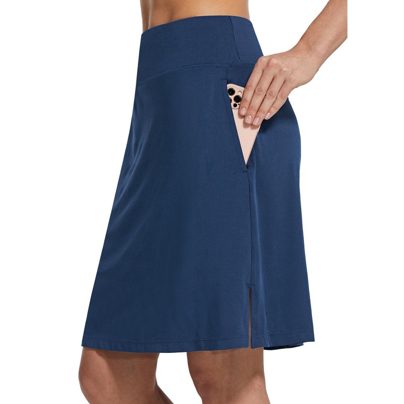BALEAF Women's 4 Pockets UV Protection 20" Modest Knee Length Skirt is made of 90% ployester, 10% spandex soft fabric, which is moisture wicking. 4 Pockets for store your tennis balls, golf balls, golf gloves, smartphone, cards and your other essentials.Built-in 7-inch mesh linner keep you enjoy your sports.Perfect for sports and casual.