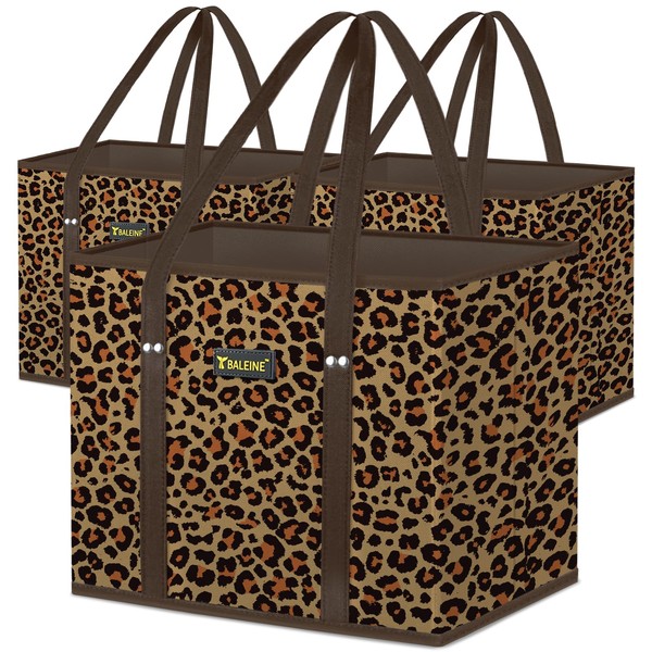 BALEINE 3Pk Reusable Grocery Bags, Foldable Shopping Bags for Groceries with Reinforced Bottom & Handles (Leopard)