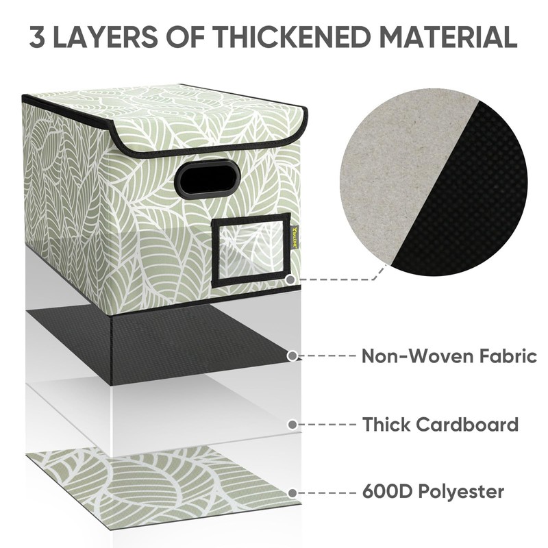 - [DURABLE MATERIAL] The outer layer of our filing box is crafted from high-quality polyester fabric and reinforced with thick cardboard in the middle. This construction ensures that the box maintains its shape and provides better bearing capacity for important documents and files. Its textured appearance can also serve as a stylish decorative element in any office or home.