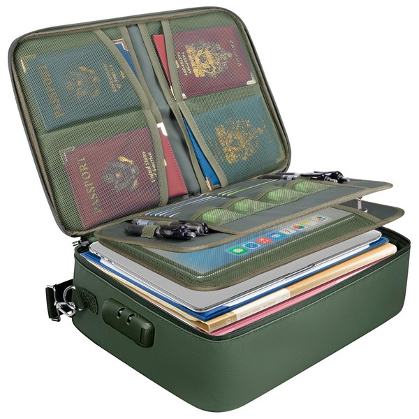 - [LARGE CAPACITY] Measuring 14.2''x10.6''x4'', this large fire proof bag for documents features a three-layer design and includes 12 different sizes of mesh compartments, 16 card slots, 4 U Disk pockets, and one spacious main pocket. Elastic straps keep items neatly in place, keeping everything remains organized.