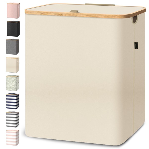 - [SLEEK DESIGN AND PREMIUM MATERIALS] Our laundry basket with lid adds a touch of elegance to any room. The natural bamboo rim gives it a timeless appeal, while the sturdy internal support structure ensures it maintains its shape, even when empty