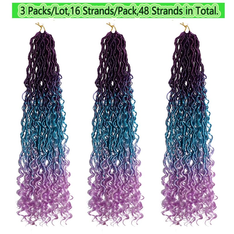 BALINGHAIR Goddess Locs Crochet Hair Ombre Purple to Lake Blue to Light Purle 22 Inch 3 Packs Bohemian Faux Locs Crochet Hair With Curly Ends Pre Looped Hair Extensions 16 Roots/Pack(C26)