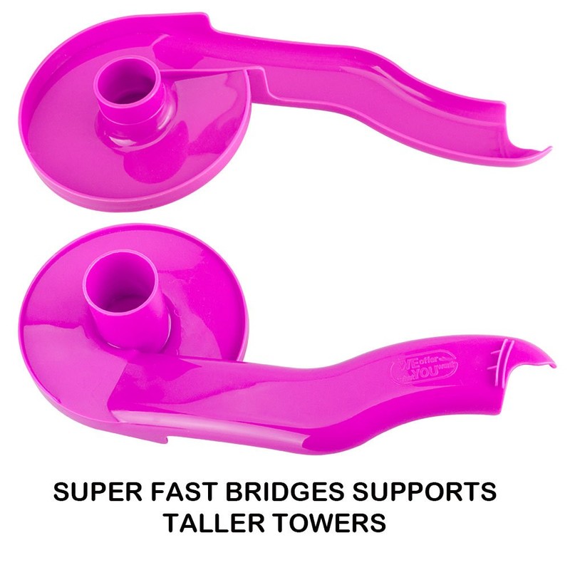 - PLAY TOGETHER - LAUNCH ALL 4 BALLS AT ONCE - Stack’em higher and watch the ball swirl it’s way down each ramp. Mix and match the building ramp and bridge colors with 4 spinning polycarbonate (PC) plastic balls that have fun noises.