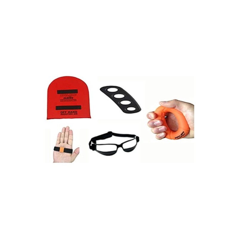 The Ball Hog Accessory Bundle Package helps players develop ball handling and shooting. BALL HOG OFF PALM- Keeping the basketball on your fingertips and off your palm is the most fundamental aspect of the jump shot. Shooting the ball from your palm breeds inconsistency, commonly referred to as streak shooting. A streak shooter can make five in a row and then miss the next eight. If you are looking to develop a more consistent jump shot by utilizing your finger tips instead of your palm, the OFF Palm Shooting Aid is for you. The BALL HOG GLOVES GRIP is a great way to strengthen your hands for ball handling, passing, shooting, rebounding and catching. The DRIBBLE GLASSES force you to keep your head up while dribbling by not allowing you to look down at the basketball. This is a great way to train yourself to see the floor while handling the ball. The enemy of every great jump shot is usually a overly utilized non-shooting hand, aka the guide hand. Whether it's a thumb that disrupts ball rotation or fingers in front of the basketball, an uncorrected guide hand can lead to a decreased shooting percentage. The BALL HOG GLOVES OFF HAND SHOOTING AID takes care of this issue by removing your guide hand from each practice shot. This allows you to focus on your shooting hand form and fundamentals. If you are looking for a tool to help perfect your jump shot, then the Ball Hog Gloves Off Hand Shooting Aid is for you. The SHOOTING (LOCK) TRAINER helps you spread your fingers and shoot the ball with consistency. Great for ball placement and muscle memory. JumpStart33, LLC assumes no responsibility for personal injury or other loss sustained by or through the use of this product. Do not initiate contact with the bottom of this training tool. Light contact only, do not aim for the face or head