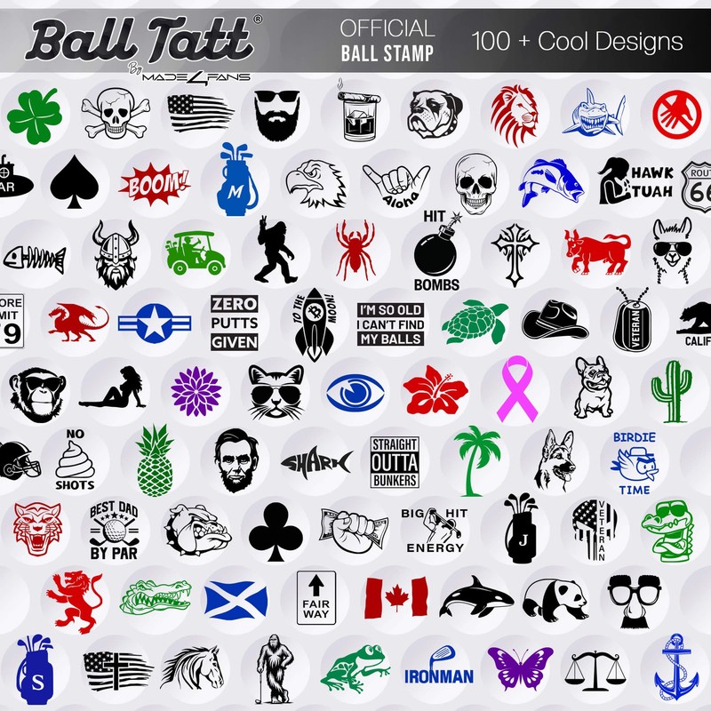 - LOTS OF UNIQUE STAMP MOTIFS: Ball Tatt golf ball stampers are available in cool emblems, stylish symbols & bold insignias! Choose golf ball stamp markers in logos, flags, emojis, funny icons, etc.