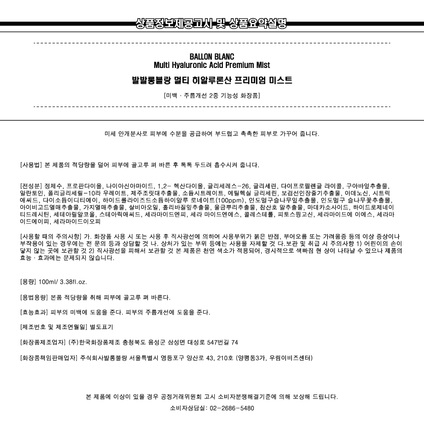 Ballon Blanc Multi Hyaluronic Acid Premium Mist 100ml / 발롱블랑 멀티 히알루론산 프리미엄 미스트 100ml